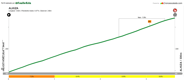 La edición de este año será, si cabe, algo más dura que las ediciones anteriores, dado que se subirá Alkiza en dos ocasiones. La primera poco antes de la mitad del recorrido, y en la segunda ya será meta. Por tanto, es probable que los escaladores tengan cierta ventaja para destacar sus cualidades.